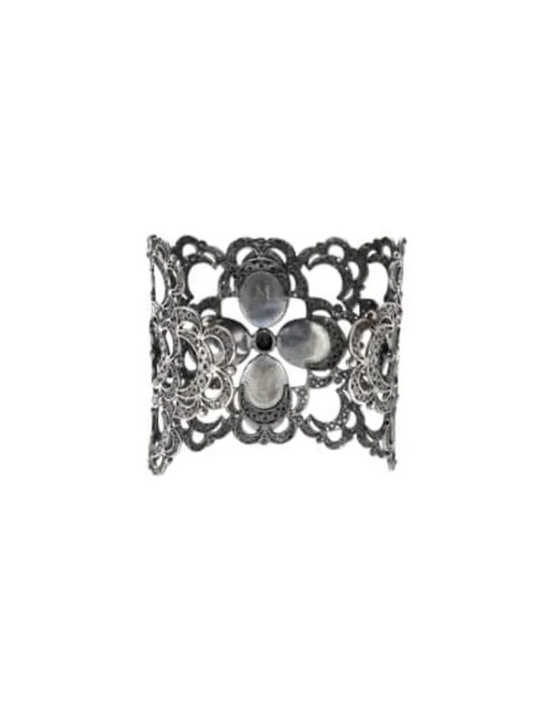 El Brazalete Tudor Es Un Elegante Guiño A La Joyería Histórica. La Pieza Cuenta Con Una Base En Elipse De Plata Con Filigrana Envejecida. Sobre Ella Posan Cuatro Medias Perlas Ovaladas En Tonos Rosa Y Gris, Que Enmarcan A Un Ónix Negro Central.