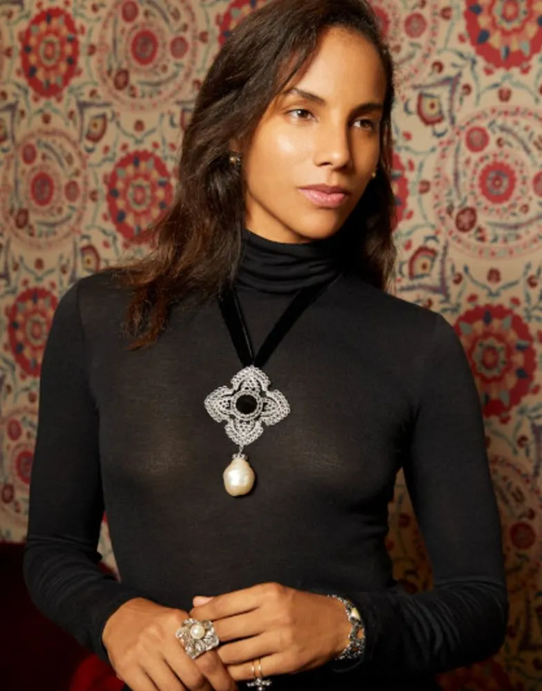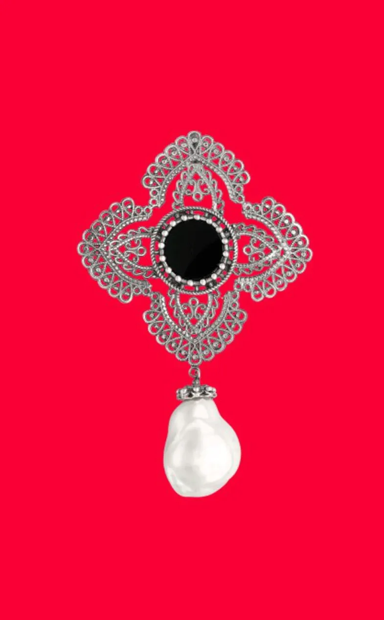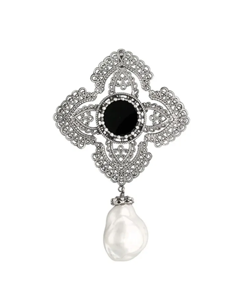 Tallado Sobre Plata Con Acabado Envejecido En Filigrana, Cuenta Con Una Preciosa Perla Barroca Blanca Que Cuelga Danzante. Bellamente Elaborada Con Un Ónix Negro Como Pieza Central, El Colgante Peregrina Es Como Una Reliquia Moderna Con La Que Podrás Sentirte Como Parte De La Historia De La Realeza Europea.