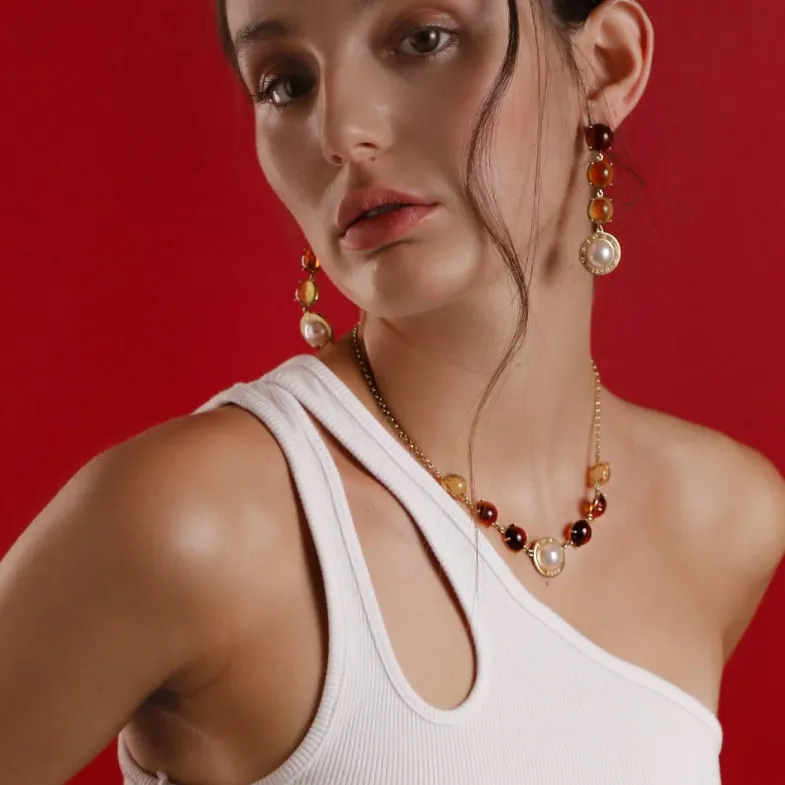 Majorica Collar Algaida Dorado Perla Media Bola Y Cristal De Murano Ambar| Cadenas Con Perlas