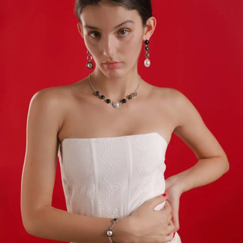 El Tono Negro Y Gris De Los Cristales De Murano Ofrecen Un Toque Refinado A La Pieza. El Juego Visual De La Geometría De Los Cristales Y La Perla En Media Bola, Harán Que Todas Las Miradas Vayan A Parar A Tu Cuello. Aprovecha La Elegancia De Los Colores De La Joya Para Cargar De Sofisticación Todos Tus Looks. ¡Elegante, Versátil Y Atemporal!