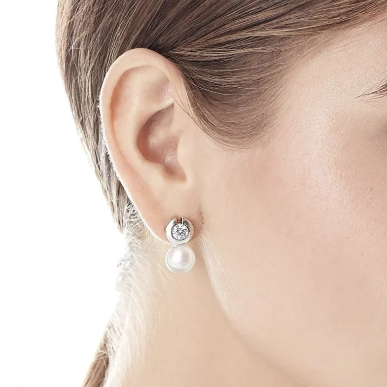Elegancia Atemporal Significa Que Menos Es Más. El Diseño Combina Una Circonita Transparente En Plata 1A Ley Y Con Una Perla Blanca Lo Que Aporta La Dosis Justa De Brillo Para Evocar Un Glamour Sofisticado. Pendientes Con Cierre Omega.