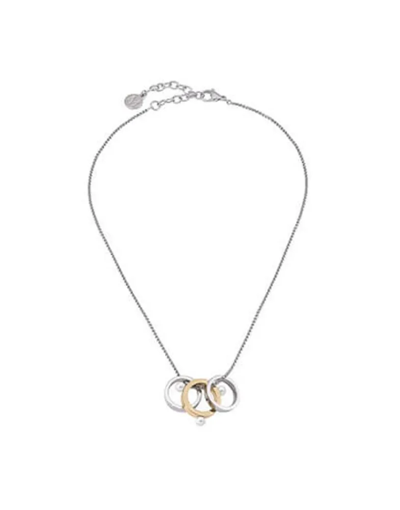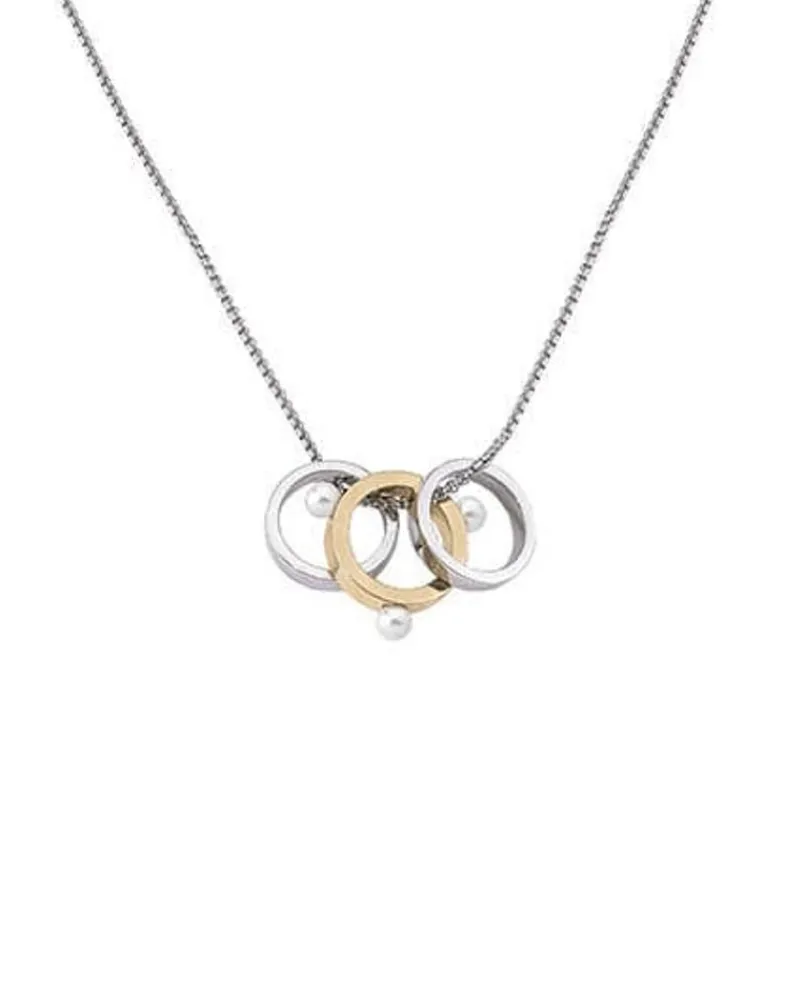 Colgante De 37/42Cm En Acero Rodiado Y Dorado Donde Descansan Tres Anillos Al Final De Una Fina Cadena De Acero Rodiado Con Perlas Blancas De3 Mm Que Parecen Pivotar A Su Alrededor. Inspirada En El Coreografo Maurice Béjart.