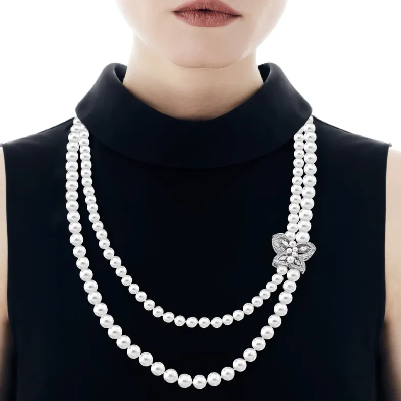 Collar Largo De 2 Vueltas De 70Cm En Plata Rodiada, Perlas Redonda Blancas De 8/10Mm Y Circonitas.